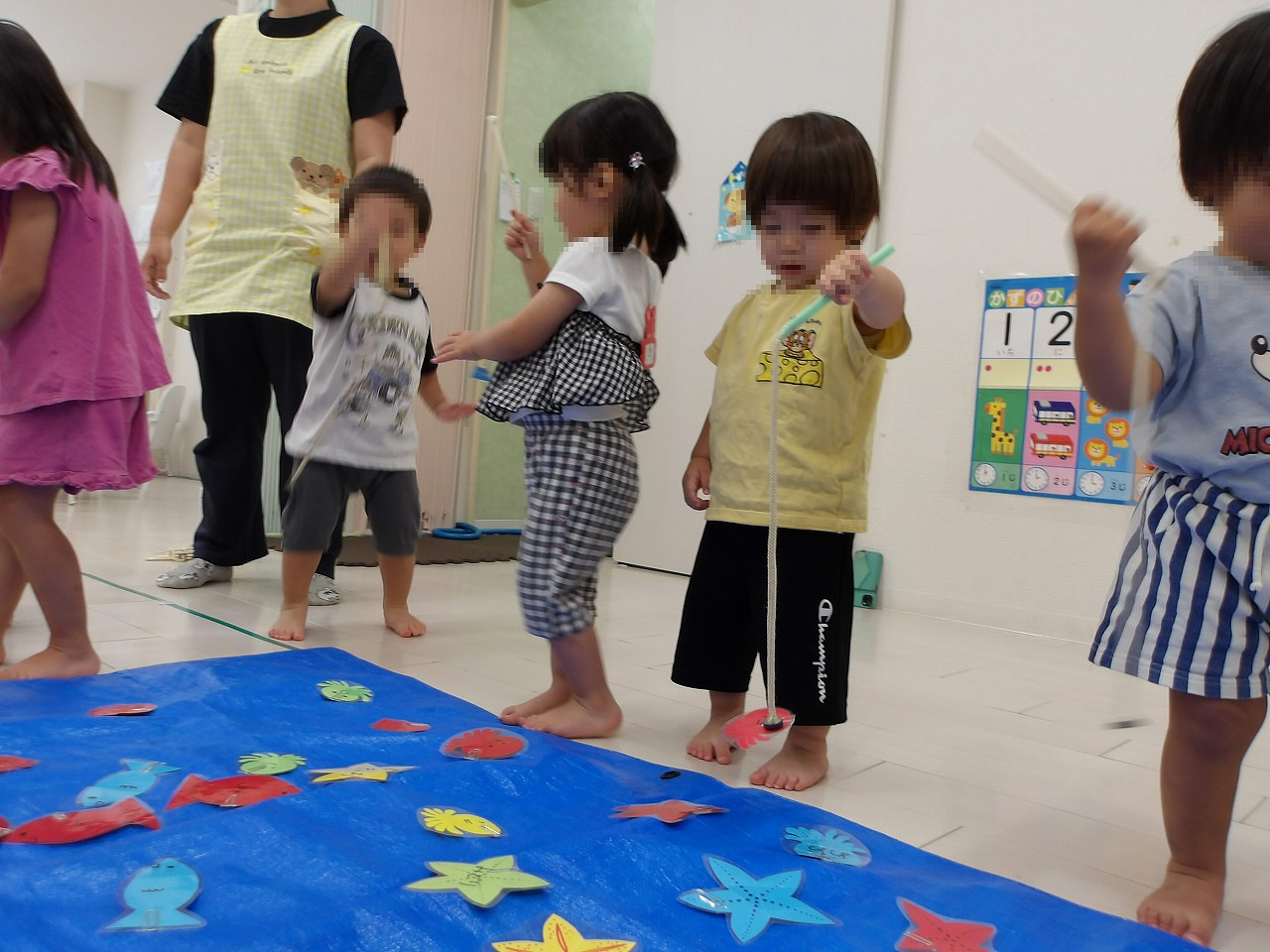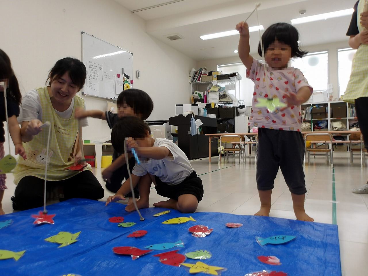 「あか」「あお」「き」「みどり」と書いている所へ、釣った魚の色を見て持って行く遊びです。最後は2チームに分かれ、どちらがたくさん釣れるか?競争しました(^-^)。