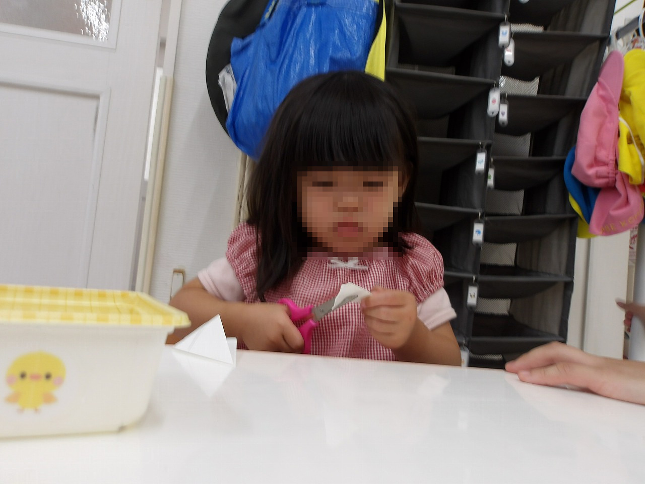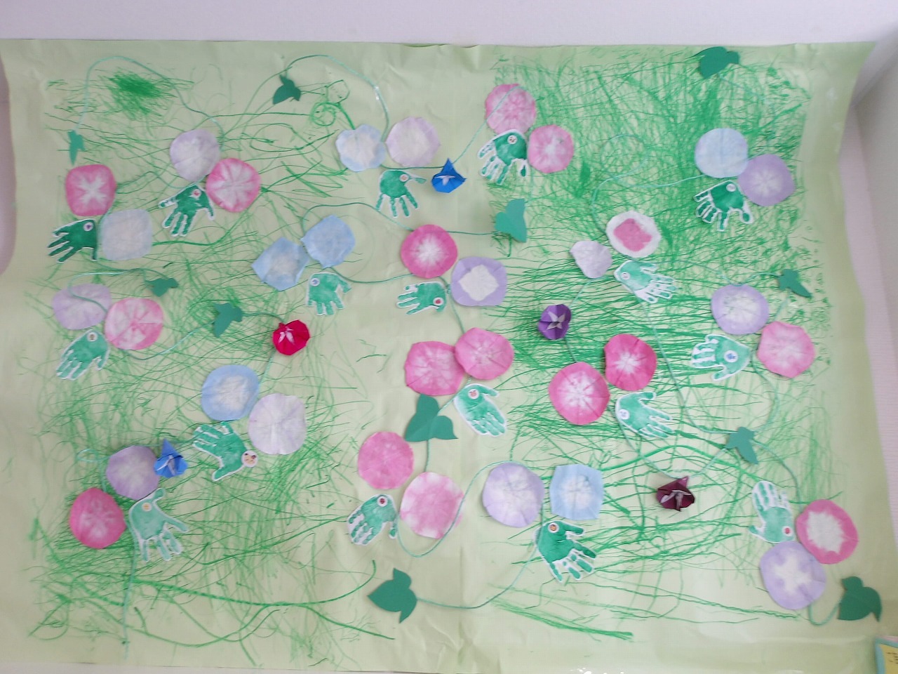 今週はアサガオを作りました。 折っている天ぷらシートを赤組(2歳児)さんはハサミでチョキチョキお花の形に切ります。切った天ぷらシートを好きな色の絵の具につけるとアサガオの出来上がり、お次は模造紙にクレヨンでカキカキしてツルを描いたら完成です(^-^)。